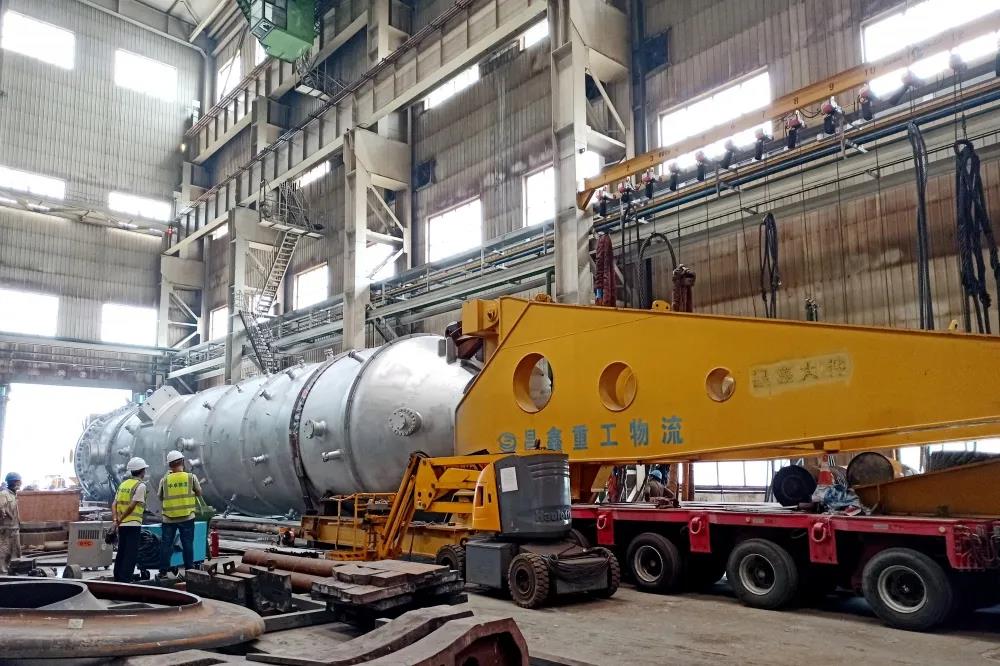 該設備總長37米,凈重約505噸,在結構上由氣化段和廢鍋段組成,兩段通過法蘭連接。由于設備整體重量、尺寸超過運輸限制,氣化段和廢鍋段在哈電鍋爐產成后,分段運往項目現場進行組裝。由于疫情原因,哈電鍋爐工程設計中心、工藝部等部門相關技術人員無法赴現場提供安裝技術指導。在現場安裝的關鍵階段,哈電鍋爐技術人員放棄國慶假期休息時間,主動加班,以視頻會議方式多次連線用戶方及項目現場,研究解決現場組裝的難點問題,確保現場安裝順利進行。同時,技術人員保持手機24小時暢通,以便及時響應用戶關切。最終,氣化段和廢鍋段于10月10日順利完成組裝。