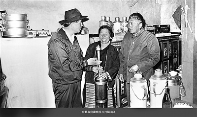 孔繁森向藏族同胞學習打酥油茶。(圖片由孔繁森同志紀念館提供)