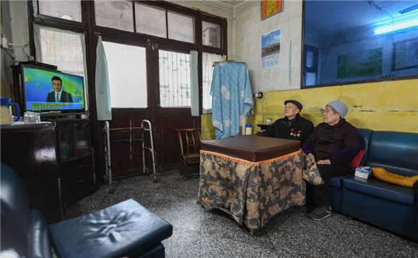 張富清和老伴在家看電視(3月31日攝)。新華社記者 程敏 攝